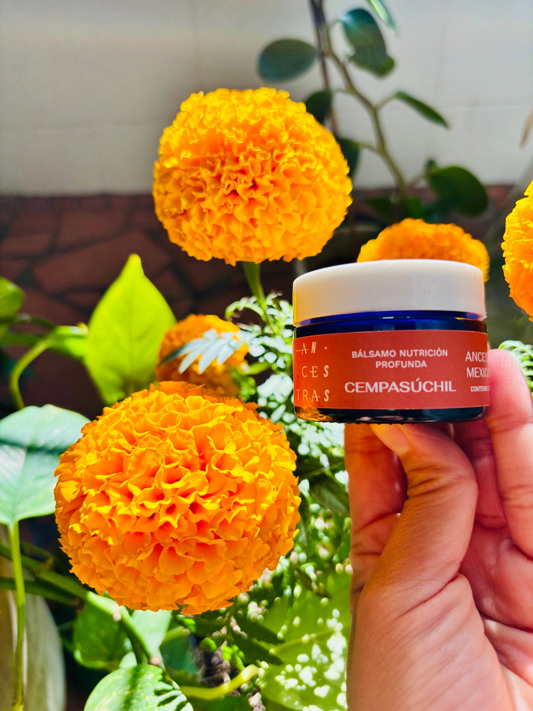 Este bálsamo es un refugio nutritivo para la piel, inspirado en los rituales de sanación mesoamericanos. En la tradición azteca, el cempasúchil ocupaba un lugar sagrado, no solo por su simbolismo, sino por su capacidad para calmar y proteger la piel.